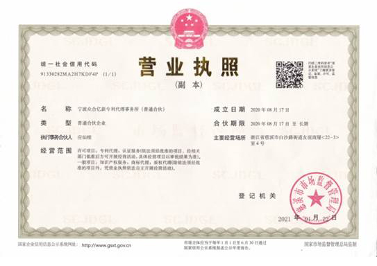 浙江億新知識產(chǎn)權(quán)服務(wù)有限公司前身為慈溪眾合知識產(chǎn)權(quán)代理事務(wù)所,創(chuàng)始于2004年,為了服務(wù)更多的創(chuàng)新企業(yè),實現(xiàn)“服務(wù)億萬創(chuàng)新企業(yè)”的理念,后更名為浙江億新知識產(chǎn)權(quán),旗下公司包括:寧波眾合億新專利代理事務(wù)所(機(jī)構(gòu)代碼33405)、中范(北京)認(rèn)證有限公司。其中寧波眾合億新專利代理事務(wù)所是慈溪市科技服務(wù)聯(lián)盟理事單位,前灣區(qū)知識產(chǎn)權(quán)工作站。公司位于浙江省慈溪市文化商務(wù)區(qū)友誼商廈,并在北京、青島設(shè)有辦事處。